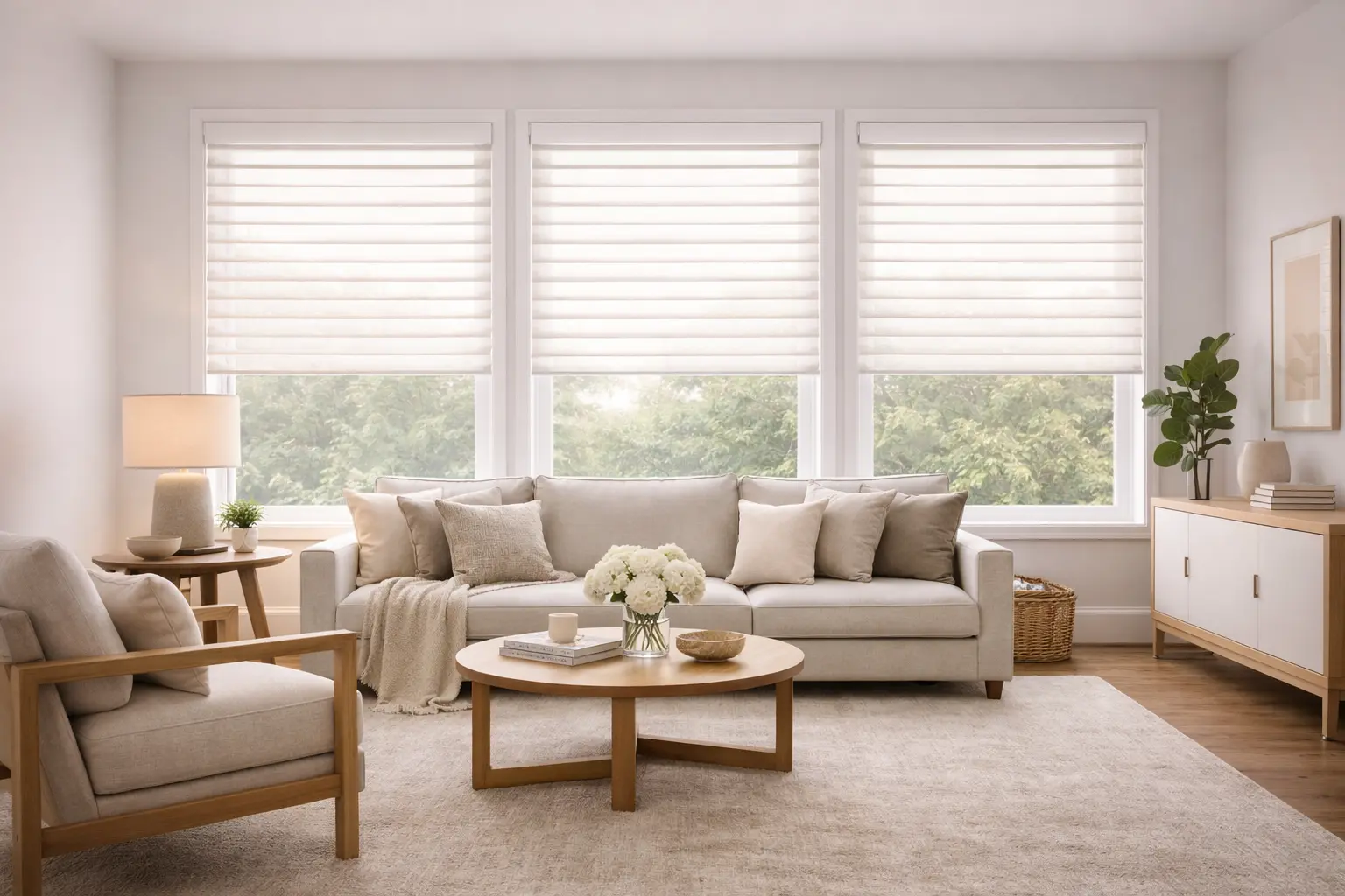 Elegant and airy, sheerview shades feature softly contoured fabric vanes suspended between layers of sheer fabric, creating a beautifully diffused glow throughout the space. This versatile design allows you to transition effortlessly from open, light-filled views to enhanced privacy, offering both sophistication and control in one seamless solution.